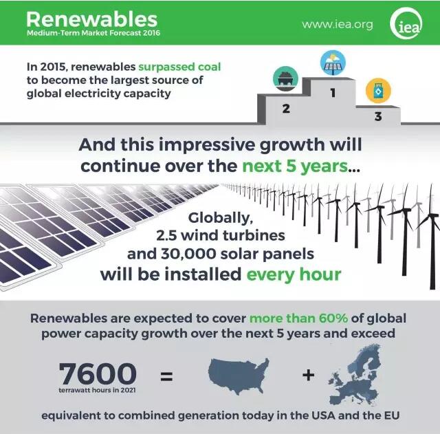 2015年,全球可再生能源發(fā)電裝機(jī)已經(jīng)超過(guò)煤電、天然氣發(fā)電裝機(jī)。IEA預(yù)測(cè)未來(lái)5年(2016-2021)可再生能源將持續(xù)高速增長(zhǎng),預(yù)計(jì)裝機(jī)增量中超過(guò)60%都將來(lái)自可再生能源,全球平均每小時(shí)都有2.5座風(fēng)機(jī)、3萬(wàn)套光伏組件安裝,2021年全球可再生能源發(fā)電量可達(dá)7600TWh(7.6萬(wàn)億千瓦時(shí)),大約相當(dāng)于目前美國(guó)、歐盟的發(fā)電量,占2021年總發(fā)電量的28%。但是,可再生能源在供熱、交通領(lǐng)域發(fā)展相對(duì)滯后,2021年占相關(guān)市場(chǎng)的比例僅為10%和4%。
