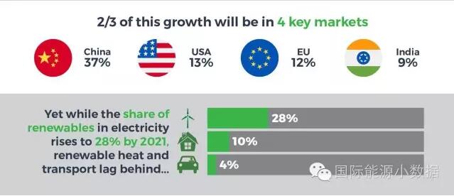此外,未來(lái)5年可再生能源市場(chǎng)的三分之二集中在4個(gè)市場(chǎng):中國(guó)(37%)、美國(guó)(13%)、歐盟(12%)、印度(9%)。
