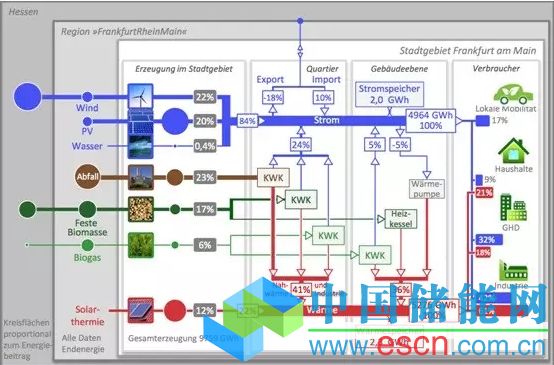 下圖為研究院給出的具體圖解,其中左邊藍色標識代表能源來源為風能、水力和太陽能,棕色代表廢料發(fā)電,綠色則代表生物質(zhì)能和沼氣發(fā)電。產(chǎn)生出的電能可分別供交通、住戶和商業(yè)樓宇以及工業(yè)使用。從圖表中還可以看出,城市能源(主要是分布式光伏)足以支撐30%供電需求以及31%的供熱需求。此外,法蘭克福周邊地區(qū)如萊茵-美因地區(qū)(50%)以及黑森地區(qū)(11.6%)可再生能源也將成為法蘭克福供電的主要來源。