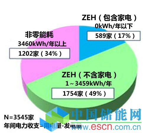 此次調(diào)查以2013年1~12月入住的3545戶為對(duì)象,分析了2014年全年的用電量、發(fā)電量和電力量收支情況。結(jié)果顯示,包含家電在內(nèi),電量收支為0kWh/年以下的ZEH比例占到了17%(589戶)。
