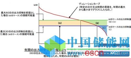 根據(jù)目前基于可再生能源電力固定價格收購制度(FIT)的規(guī)則,電力公司對輸出功率在500kW以上的可再生能源發(fā)電設(shè)備,每年可要求無補償輸出功率控制的天數(shù)在30天以下。此時的輸出功率控制基本世以天數(shù)來管理的。但光伏及風(fēng)力發(fā)電量在1天內(nèi)(24小時)都超出需求的可能性不大。如果改為僅在超出需求的時段控制輸出功率,則可增加并網(wǎng)發(fā)電量(kWh)(圖1)。