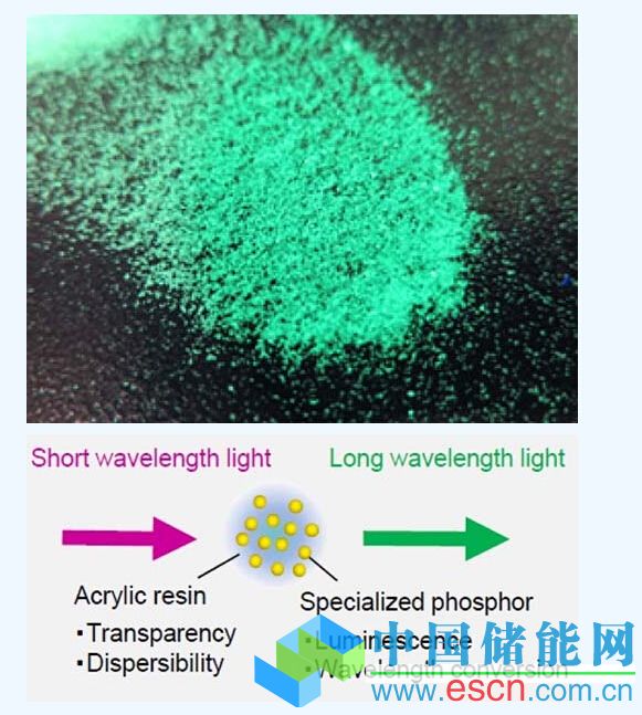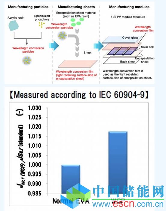 該公司表示,材料制造商將分布在丙稀酸樹脂粒子內的熒光材料與EVA封裝片材混合,獲得短波長光(紫外線),并且將其轉換為長波長光(可見光),對現(xiàn)有薄膜配方的耐久性沒有影響。