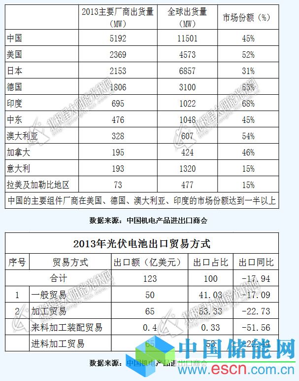 中國儲能網(wǎng)訊:近日,記者從中國機電產(chǎn)品進出口商會獲悉,2013年光伏電池出口貿(mào)易主要分為一般貿(mào)易和加工貿(mào)易兩種方式,其中一般貿(mào)易出口額為123億美元,加工貿(mào)易出口額65億美元,加工貿(mào)易中的來料加工裝配貿(mào)易出口額僅為0.4億美元,進料加工貿(mào)易則以65億美元的出口額占據(jù)絕對優(yōu)勢。