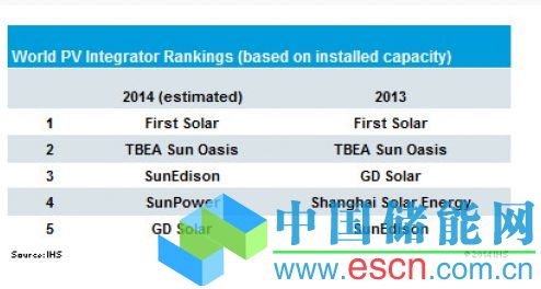 IHS預(yù)計(jì)的2014年頂尖EPC公司排名顯示中美公司之間在排名頂端正在進(jìn)行的競(jìng)爭(zhēng),最終達(dá)到勢(shì)均力敵。