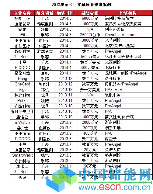 此外,多支可穿戴基金的設立也進一步加快了巨頭在可穿戴市場創(chuàng)建生態(tài)系統(tǒng)的步伐:2013年4月,Google Ventures聯(lián)合Andreessen Horowitz、KPCB成立Glass Collective平臺,為谷歌眼鏡應用開發(fā)者提供資金及服務;2013年6月,Leap Motion的投資者高原資本投入2500萬美元成立了名為Leap Fund的基金,用于幫助企業(yè)搭建Leap Motion技術平臺,推動手勢識別技術應用深入到教育、安全、醫(yī)療等多個行業(yè);2013年12月,富士康宣布將建立一支約2億新臺幣規(guī)模的投資基金,資助創(chuàng)業(yè)公司開發(fā)新型可穿戴技術、設備和軟件應用,把觸角伸向軟件、云計算、電信服務和智能化的未來。