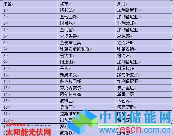 這份報告中還提到一些美國太陽能發(fā)電的一些數(shù)據(jù)。比如說,全美太陽能發(fā)電應用城市20強,收集了六年來美國主要太陽能發(fā)電應用城市的裝機數(shù)據(jù)。其中,安裝量最高的5個城市(三個在加利福尼亞,以及火奴魯魯和鳳凰城)的安裝量數(shù)據(jù)最令人吃驚,這些安裝量最高的城市如印第安納波利斯、紐瓦克的數(shù)據(jù)代表了美國當前太陽能發(fā)展的普遍現(xiàn)狀。
