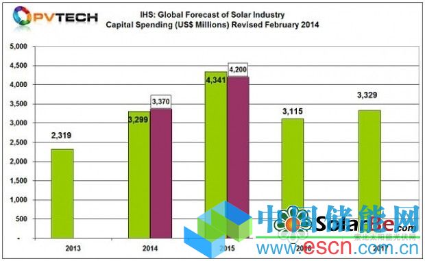中國儲(chǔ)能網(wǎng)訊:市場(chǎng)調(diào)研公司IHS日前重申其預(yù)期,光伏資本支出將從2013年的低點(diǎn)增加42%,在2014年達(dá)33.7億美元。