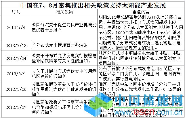 EnergyTrend表示,先前中歐兩方貿(mào)易戰(zhàn)消息眾說紛紜之時,中國政府為協(xié)助太陽能企業(yè)發(fā)展,在7、8月積極推出支援太陽能發(fā)展相關(guān)政策,力圖推動中國市場需求以消化廠商產(chǎn)能。整體來看,2013到2015年可能以6、10、12GW的安裝量,分階段沖刺2015年前總安裝量35GW的目標(biāo),此外也頒布光伏電站上網(wǎng)電價標(biāo)準(zhǔn)和分布式光伏發(fā)電每千瓦時0.42元的補貼標(biāo)準(zhǔn),并宣示加強抑制太陽能產(chǎn)能盲目擴張,顯示中國政府加大力道調(diào)整太陽能產(chǎn)業(yè)結(jié)構(gòu)。EnergyTrend認為,第四季太陽能市場主要會由中、日、美等市場主導(dǎo),而中國又是其中最具發(fā)展?jié)摿Φ氖袌?,中國市場的變化將牽動中國多?shù)太陽能企業(yè)走向,進而影響全球太陽能產(chǎn)業(yè)發(fā)展。