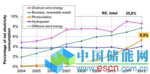 中國(guó)儲(chǔ)能網(wǎng)訊:根據(jù)能源和水資源聯(lián)邦協(xié)會(huì)(BDEW)提供的數(shù)據(jù)估算,在2012年太陽(yáng)能光伏發(fā)電總計(jì)28TWh,占德國(guó)電力凈消耗的5.3%(同期增長(zhǎng)20.8%)??傮w而言,可再生能源占電量?jī)粝?5.8%的。同時(shí)太陽(yáng)能電力和可再生能源分別占德國(guó)總發(fā)電量的4.7%和23%。