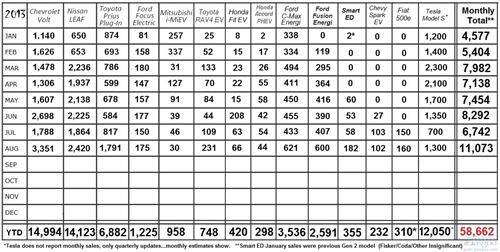 根據(jù)美國(guó)電驅(qū)動(dòng)運(yùn)輸協(xié)會(huì)EDTA(Electric Drive Transportation Association)等機(jī)構(gòu)發(fā)布的數(shù)據(jù),美國(guó)8月份插電式電動(dòng)車(包括純電動(dòng)車和插電式混合動(dòng)力車)銷量為11,073輛,較之2012年8月份的4,715輛同比激增134.9%,實(shí)現(xiàn)翻倍;較7月份環(huán)比大漲52.0%。這也是插電式電動(dòng)車在美單月銷量首次突破萬(wàn)輛大關(guān),之前的月度銷量紀(jì)錄為2012年12月的8,559輛。