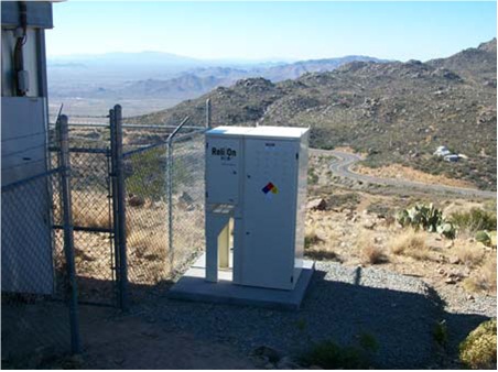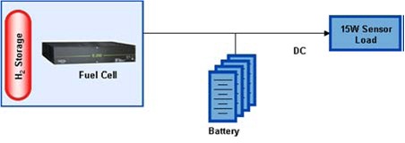 另外,離網(wǎng)設(shè)備也可使用燃料電池作為電源,如鐵路路段的故障探測(cè)器,這種設(shè)備的用電要求很低(如15W),只需為其配備一個(gè)140amph的蓄電池和175W的燃料電池就可以了(如下圖所示)。儲(chǔ)氫罐中儲(chǔ)存45~90kWh的氫氣,可以連續(xù)工作100~200天。
