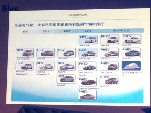 基于對(duì)用戶的分析,大眾在車型數(shù)量上仍然偏向于插電式混合動(dòng)力。大眾新能源汽車車型分布顯示,2013年有e-up!和e-golf這兩款電動(dòng)汽車,插電式混合動(dòng)力汽車有三款,其中兩款為保時(shí)捷品牌車型,一款為今年年初推出的大眾XL1。而2014年開始,大眾將陸續(xù)推出6款插電式混合動(dòng)力汽車,這些插電式混合動(dòng)力汽車都是基于大眾集團(tuán)旗下的經(jīng)典車型進(jìn)化而來的。