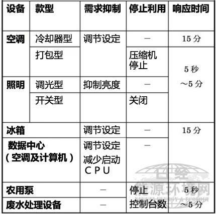 美國勞倫斯伯克利國家研究室2012年7月公布了以“高速自動(dòng)需求響應(yīng)與可再生能源整合”為題的報(bào)告。據(jù)該報(bào)告推算,如果以整個(gè)加利福尼亞州的商業(yè)及產(chǎn)業(yè)設(shè)施中可調(diào)節(jié)輸出功率的電力設(shè)備為對(duì)象實(shí)施高速自動(dòng)需求響應(yīng),就可抑制0.18~0.9吉瓦的電力需求(表1)。