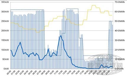 直方柱表示冷庫耗電量,實(shí)線曲線表示風(fēng)力發(fā)電量,淺色虛線表示電力現(xiàn)貨價(jià)格,深色虛線表示事先預(yù)測(cè)的負(fù)載分配??赏ㄟ^在啟動(dòng)風(fēng)力發(fā)電時(shí)進(jìn)行冷卻,在電價(jià)較高時(shí)段抑制運(yùn)轉(zhuǎn),享受成本價(jià)值。(出處:EWEP)(點(diǎn)擊放大)