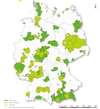 德國295個行政區(qū)域中3個縣區(qū):北弗里斯蘭、普利希尼茨、迪特馬爾申可再生能源供電量分別達到260%、261%、280%,創(chuàng)造了“能源轉(zhuǎn)型”的奇跡,成為德國乃至整個歐洲的綠色榜樣。與此同時,德國其他區(qū)域也不甘示弱,或已實現(xiàn)了100%可再生能源電力,或在不斷接近這個數(shù)值。(如圖所示)