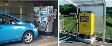 為了普及純電動(dòng)汽車和插電式混合動(dòng)力車,日本在加緊建設(shè)充電基礎(chǔ)設(shè)施。照片為神奈川縣政府設(shè)置的充電器(左)和CHAdeMO協(xié)議會(huì)推進(jìn)普及的快速充電器(右)。