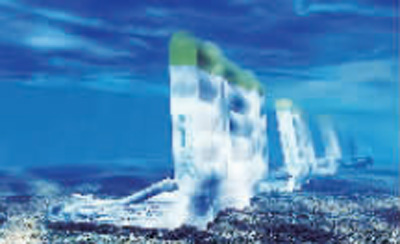 如圖所示,蘇格蘭當(dāng)前項(xiàng)目準(zhǔn)備的更新一代Oyster波浪發(fā)電機(jī)目前正在研發(fā)中。每只“牡蠣”,也就是技術(shù)層面上所知的振蕩浪涌轉(zhuǎn)換器(OWSC),安裝在海底的一個(gè)巨大杠桿,在海浪中來回?fù)u擺。它在海水深達(dá)30至50英尺的岸邊運(yùn)轉(zhuǎn)。高效率的機(jī)器可以成群安放,在極端天氣下也能工作。