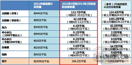日本在2012年4月到2013年2月的可再生能源發(fā)電裝機(jī)容量。不過,在此期間還有35萬千瓦的煤炭混燃發(fā)電設(shè)備獲得審批,但因不適合將其所有發(fā)電輸出功率都作為生物質(zhì)發(fā)電,因此未計(jì)入可再生能源裝機(jī)容量(資料:經(jīng)濟(jì)產(chǎn)業(yè)?。?。