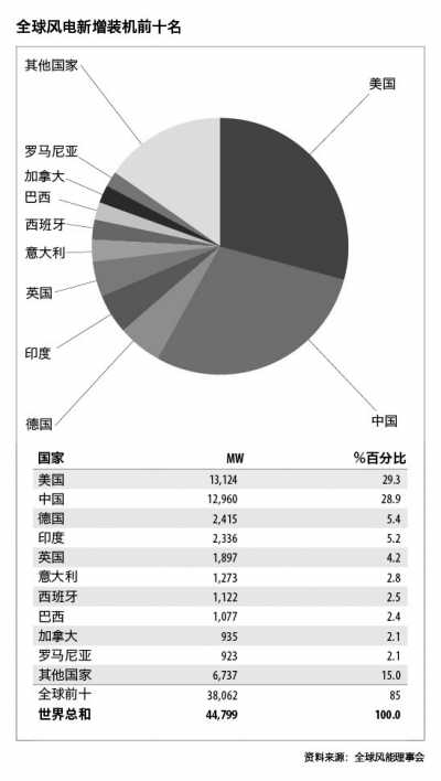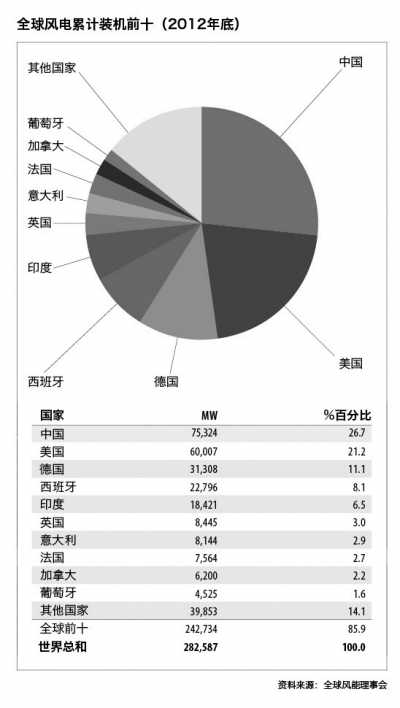 2009-2011年,中國保持年新增裝機容量全球第一的位置。而2012年美國僅以164 MW的優(yōu)勢,重回年新增裝機市場全球第一的地位。然而,美國的生產稅收抵免(PTC)政策推遲到2013年1月1日宣布延續(xù),意味著2013年美國市場的裝機容量將陡然下降,而后在2014年逐漸恢復。受到歐洲主權債務危機等影響,歐洲各國的國內可再生能源政策具有不確定性,歐洲2012年的創(chuàng)紀錄的裝機容量將在很可能要到2014年才可能重演。