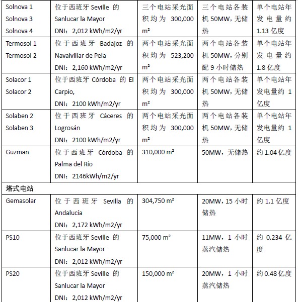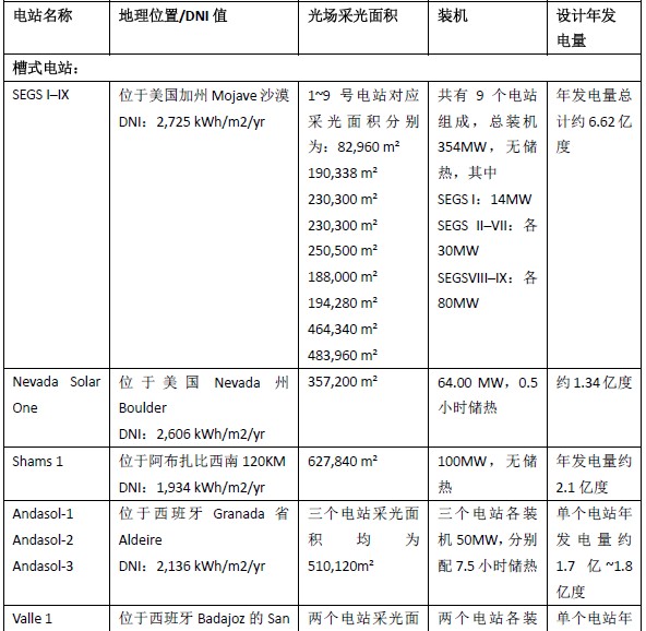 從上表可見,在槽式光熱電站建設(shè)最多的西班牙市場,由于政策方面的限定,幾乎所有電站的裝機(jī)均為50MW,鑒于項(xiàng)目所在地的DNI差別不大,多個(gè)電站的配置和發(fā)電量相差不多,一個(gè)50MW的無儲(chǔ)熱槽式光熱電站,其采光面積在30萬平方米左右,發(fā)電量1億度左右。配置儲(chǔ)熱后,采光面積需同步增加,發(fā)電量也大幅增加。塔式和菲涅爾光熱發(fā)電的已投運(yùn)商業(yè)化項(xiàng)目較少,碟式為零。