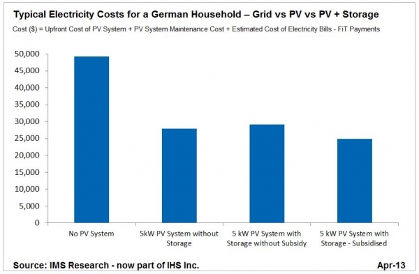 補貼將推動帶有存儲的光伏系統(tǒng)的成本下降。圖片來源:IHS
