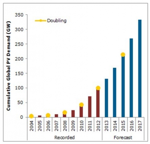 中國儲(chǔ)能網(wǎng)訊:日前,根據(jù)NPD Solarbuzz最新出版的Marketbuzz 2013報(bào)告,預(yù)計(jì)全球光伏市場累計(jì)安裝量在2013-2015年期間再翻一倍,超過200GW。