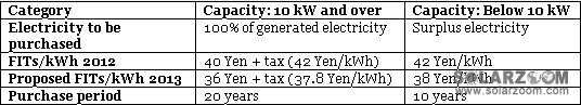 據(jù)日本經(jīng)濟(jì)產(chǎn)業(yè)省透露,自2012年7月至12月期間,約有4GW的光伏項(xiàng)目已經(jīng)獲得FIT項(xiàng)目的審批,這些光伏項(xiàng)目可獲得每千瓦時(shí)42日元的補(bǔ)貼。而最新的補(bǔ)貼費(fèi)率提案請(qǐng)見下表: