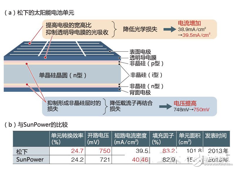 松下通過(guò)降低光學(xué)損失和載流子再結(jié)合損失等,使單元轉(zhuǎn)換效率達(dá)到了24.7%(a)。與SunPower公司的單元相比,短路電流密度稍低(b)。