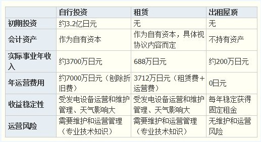 一般來說,建設(shè)百萬瓦級太陽能發(fā)電設(shè)施的方法有三種:(1)自行投資;(2)租賃太陽能電池板;(3)向電力公司出租屋頂。對比這三種計劃可以發(fā)現(xiàn),出租屋頂?shù)娘L險最低(表1)。