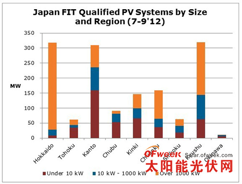 日本政府在今年7月開始實施全國上網(wǎng)電價。僅在7月到9月期間,就有接近1.5 GW的光伏項目申報并得到了補(bǔ)貼資格,占到了日本政府計劃在2012年7月到2013年3月期間安裝量的60%。在這1.5 GW的光伏項目中,規(guī)模大于1 MW的項目比例超過了50%。 具體到各個地區(qū)來看,九州島地區(qū)獲得補(bǔ)貼資格的項目總?cè)萘孔疃唷?北海道地區(qū)獲批的大型地面項目超過其他區(qū)域,主要得益于大量可利用的空地資源。而在人口密度相對較高的關(guān)東地區(qū),核準(zhǔn)的項目以小型屋頂項目為主。
