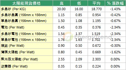 由于長假與產(chǎn)能調(diào)整的關(guān)系,近期交易清淡,本周多晶硅晶圓的平均價格來到$0.954/piece,小跌0.42%;單晶硅晶圓方面,業(yè)者表示雖然需求不佳,但相關(guān)產(chǎn)品的價格持續(xù)調(diào)降,本周平均價格跌破$1.2/piece,來到$1.195/piece,跌幅為0.67%。而在電池與模塊方面,中國與臺灣業(yè)者在價格幾乎同步,目前主要價格區(qū)間集中在$0.36/Watt至$0.38/Watt之間,使得本周電池平均價格來到$0.376/Watt,跌幅為2.34%,為本周跌幅較為明顯的產(chǎn)品;在模塊方面,近期價格已出現(xiàn)明顯調(diào)整,再加上長假與展會效應(yīng),本周價格出現(xiàn)觀望,目前平均價格為$0.672/Watt,跌幅為0.3%,受到硅晶模塊價格壓力,部分中國薄膜業(yè)者也選擇降價因應(yīng),使得本周薄膜產(chǎn)品的平均價格出現(xiàn)下來,來到$0.669/Watt,跌幅為1.62%。