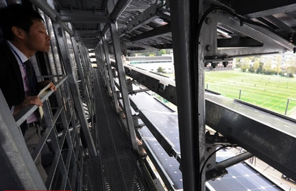 東京工業(yè)大學(xué)日前建成了一座“自給自足”的研究樓,依靠太陽能發(fā)電和燃料電池供應(yīng)電力。圖為工作人員觀看建筑表面安裝的太陽能發(fā)電板。(攝影 關(guān)賢一郎)