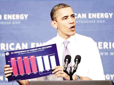 中國儲能網(wǎng)訊:美國總統(tǒng)奧巴馬手持圖表,“標(biāo)題是美國對外國石油進口依賴正在減小”。