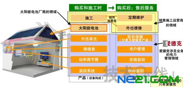 為搶占不斷擴(kuò)大的日本國內(nèi)市場,海外太陽能電池廠商及日本國內(nèi)住宅設(shè)備運(yùn)營商等相繼涉足該領(lǐng)域。不過愛德克表示,由于電力控制裝置等產(chǎn)品在日本有嚴(yán)格的技術(shù)標(biāo)準(zhǔn),因此供貨廠商有限。所以,愛德克決定在投產(chǎn)電力控制裝置等產(chǎn)品的同時(shí),提供電力控制裝置與電力監(jiān)控服務(wù)相結(jié)合的“電力管理業(yè)務(wù)”。