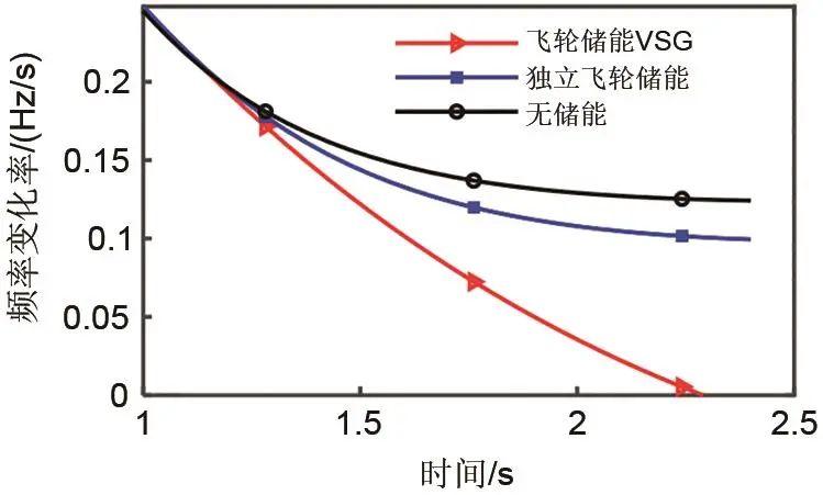 從系統(tǒng)頻率響應(yīng)過(guò)程來(lái)看,系統(tǒng)慣量響應(yīng)集中體現(xiàn)在功率擾動(dòng)發(fā)生后至頻率最低點(diǎn)時(shí)間范圍內(nèi),該時(shí)間段的頻率變化率為圖片,是衡量系統(tǒng)慣量響應(yīng)的主要參數(shù)之一,系統(tǒng)慣性越大,頻率變化率越低。無(wú)儲(chǔ)能調(diào)節(jié)、獨(dú)立飛輪儲(chǔ)能調(diào)節(jié)和飛輪儲(chǔ)能VSG調(diào)節(jié)時(shí),系統(tǒng)的頻率變化率如圖8所示。