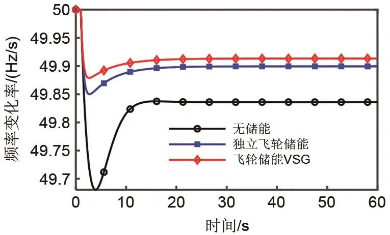 假設(shè)該區(qū)域在1 s時(shí)受到5%的有功功率缺額擾動(dòng),分別計(jì)算分析無(wú)儲(chǔ)能調(diào)節(jié)、采用獨(dú)立飛輪儲(chǔ)能調(diào)節(jié)輔助(并網(wǎng)變換器無(wú)VSG)和飛輪儲(chǔ)能VSG輔助調(diào)節(jié)三種情況下的系統(tǒng)頻率響應(yīng),如圖7所示。