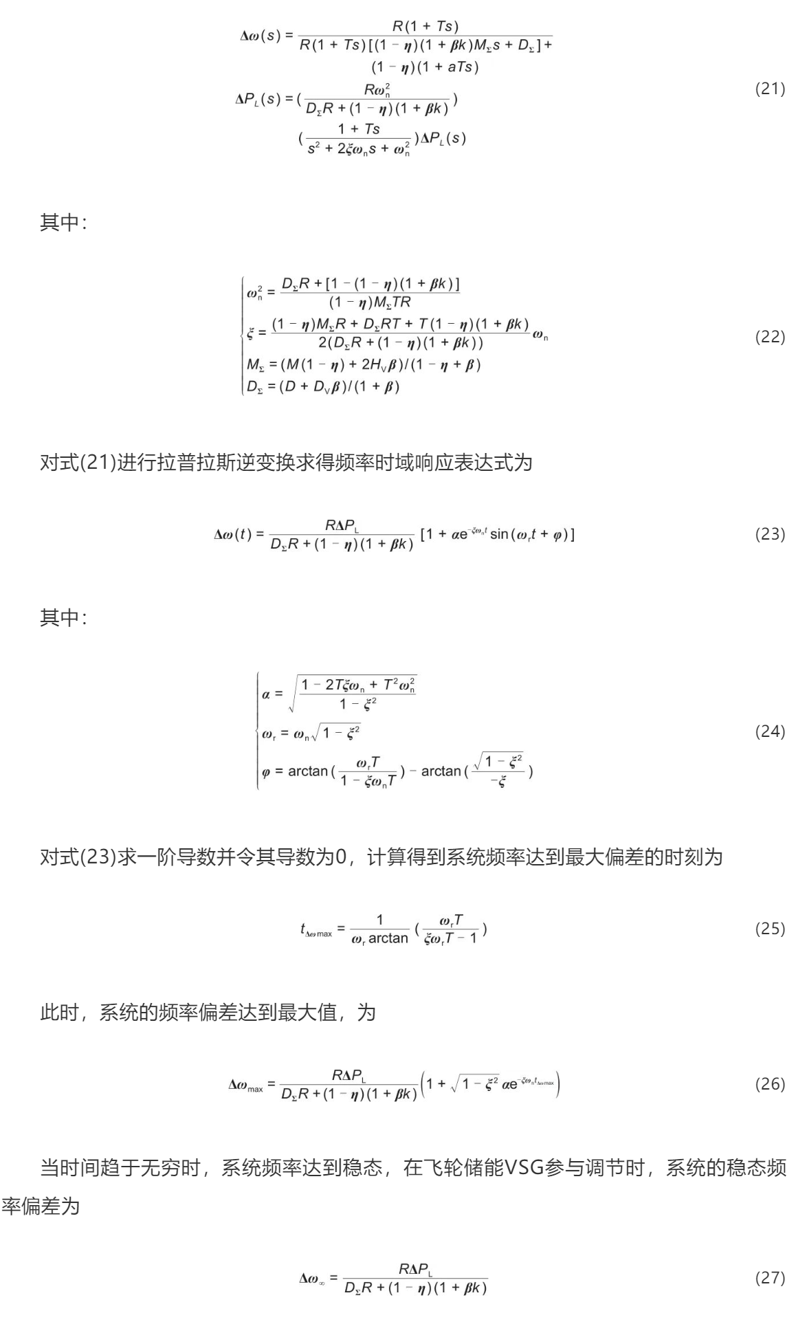 飛輪儲(chǔ)能VSG具備快速響應(yīng)能力,圖5所示的含飛輪儲(chǔ)能VSG的擴(kuò)展電力系統(tǒng)頻率響應(yīng)模型中通常圖片=0.03 s,圖片環(huán)節(jié)近似為幅值為1的環(huán)節(jié)。圖5所示系統(tǒng)受到負(fù)荷功率擾動(dòng)圖片后的頻率動(dòng)態(tài)響應(yīng)過(guò)程可以表示為