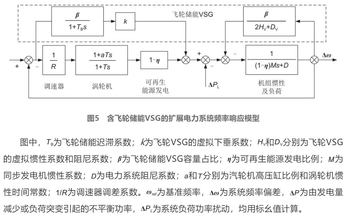 傳統(tǒng)電力系統(tǒng)頻率響應(yīng)模型(SFR)由調(diào)速器、原動(dòng)機(jī)、同步發(fā)電機(jī)組和負(fù)載組成,模型建立過(guò)程中對(duì)其進(jìn)行等效處理和合理簡(jiǎn)化。可再生能源比例不斷升高的電力系統(tǒng)中,可再生能源發(fā)電比例的增加通過(guò)關(guān)閉傳統(tǒng)同步發(fā)電機(jī)組來(lái)實(shí)現(xiàn)。假設(shè)可再生能源不參與一次調(diào)頻也不提供慣性,在SFR模型的基礎(chǔ)上,引入可再生能源發(fā)電比例的變量圖片,得到含可再生能源的電力系統(tǒng)擴(kuò)展頻率響應(yīng)模型。根據(jù)電力系統(tǒng)頻率控制原理,飛輪儲(chǔ)能VSG并網(wǎng)調(diào)頻時(shí)形成功率閉環(huán)和參考頻率雙閉環(huán),對(duì)應(yīng)飛輪儲(chǔ)能VSG的轉(zhuǎn)子運(yùn)動(dòng)方程和虛擬下垂控制過(guò)程,得到含飛輪儲(chǔ)能VSG的擴(kuò)展電力系統(tǒng)頻率響應(yīng)模型如圖5所示。