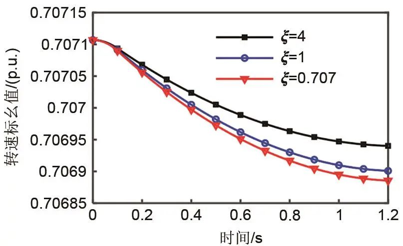 為支撐飛輪儲(chǔ)能VSG轉(zhuǎn)子運(yùn)動(dòng)過(guò)程,不同阻尼比下飛輪儲(chǔ)能均能及時(shí)響應(yīng),通過(guò)轉(zhuǎn)速變化快速釋能提供系統(tǒng)所需的功率和能量支撐,飛輪轉(zhuǎn)速變化如圖4所示。