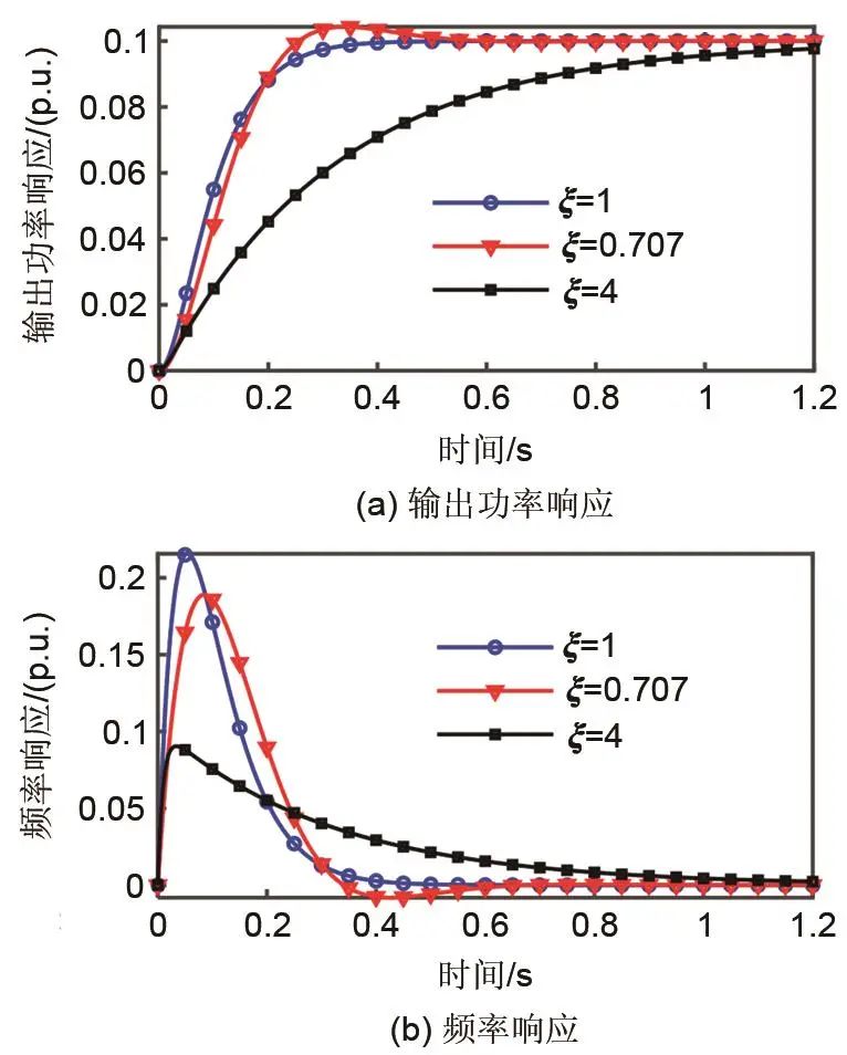 不同阻尼狀態(tài)下,飛輪儲(chǔ)能VSG響應(yīng)速度在秒級(jí)之內(nèi),臨界阻尼和欠阻尼狀況下響應(yīng)速度均達(dá)到毫秒級(jí)別,快速平抑系統(tǒng)功率變化達(dá)到穩(wěn)定狀態(tài),充分發(fā)揮了飛輪儲(chǔ)能系統(tǒng)功率響應(yīng)速度快的優(yōu)勢(shì)。當(dāng)阻尼比為0.707時(shí),飛輪儲(chǔ)能VSG動(dòng)態(tài)響應(yīng)較快、超調(diào)小,綜合響應(yīng)效果最佳。