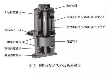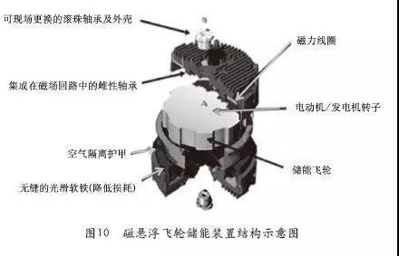 磁懸浮飛輪儲(chǔ)能技術(shù)一般是以高速旋轉(zhuǎn)的飛輪鐵芯作為機(jī)械能量的存儲(chǔ)介質(zhì),飛輪等器件都被密封在一個(gè)密閉的真空容器內(nèi),以有效地避免空氣阻力的影響,同時(shí)為了降低飛輪旋轉(zhuǎn)時(shí)的損耗,提高飛輪的轉(zhuǎn)速和儲(chǔ)能的效率,在飛輪儲(chǔ)能裝置內(nèi)使用磁懸浮技術(shù)對(duì)飛輪加以控制,并利用電動(dòng)機(jī)/發(fā)電機(jī)和能量轉(zhuǎn)換控制系統(tǒng)來(lái)控制電能的輸入和輸出。圖10即為磁懸浮飛輪儲(chǔ)能裝置的結(jié)構(gòu)示意圖。