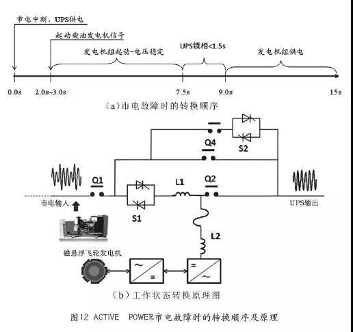 當(dāng)市電正常時(shí),市電通過(guò)自動(dòng)切換開(kāi)關(guān)進(jìn)入濾波補(bǔ)償柜(暫這樣稱(chēng)呼)將輸入電壓正弦波中的干擾和失真加以整理,使其送到關(guān)鍵負(fù)載的電壓波是高質(zhì)量的。一旦市電故障或異常,自動(dòng)切換開(kāi)關(guān)就斷開(kāi)市電并送出柴油發(fā)電機(jī)起動(dòng)命令,同時(shí)率波補(bǔ)償柜一方面給增強(qiáng)型發(fā)電機(jī)啟動(dòng)模塊用之發(fā)電機(jī)發(fā)電也同時(shí)接通柴油發(fā)電機(jī)的24V起動(dòng)電池啟動(dòng)柴油發(fā)動(dòng)機(jī)。在這里需要說(shuō)明的是柴油發(fā)電機(jī)的發(fā)電機(jī)和增強(qiáng)型發(fā)電機(jī)啟動(dòng)模塊不是同一個(gè)裝置,它是磁懸浮飛輪發(fā)電機(jī)。對(duì)該系統(tǒng)的整個(gè)工作由系統(tǒng)標(biāo)配的監(jiān)控軟件來(lái)監(jiān)控和分析。圖12(a)為ACTIVEPOWER市電故障時(shí)的轉(zhuǎn)換時(shí)間順序。為了方便介紹,假如市電在0.0s停電,在2.0s~3.0s之間發(fā)出柴油發(fā)電機(jī)起動(dòng)信號(hào),一般柴油發(fā)動(dòng)機(jī)5s就可以達(dá)到額定轉(zhuǎn)數(shù),到7.5s時(shí)柴油發(fā)電機(jī)已經(jīng)達(dá)到額定轉(zhuǎn)數(shù),但此時(shí)儲(chǔ)能飛輪的轉(zhuǎn)數(shù)尚未降到和柴油發(fā)電機(jī)同步的程度,所以柴油發(fā)電機(jī)此時(shí)處于空轉(zhuǎn)等待狀態(tài),大概等待1s左右儲(chǔ)能飛輪的轉(zhuǎn)數(shù)和柴油發(fā)電機(jī)同步了,即柴油發(fā)電機(jī)的輸出電壓頻率和相位與磁懸浮飛輪發(fā)電機(jī)發(fā)出的電壓經(jīng)一系列變換后的輸出電壓一致了,二者馬上鎖相,此后的負(fù)載供電就就由柴油發(fā)電機(jī)來(lái)代替了,這整個(gè)過(guò)程必須在15s以?xún)?nèi)完成,一直到市電恢復(fù)。