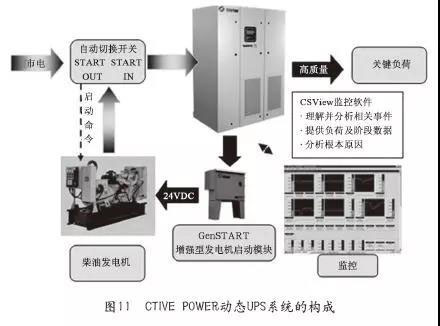 一旦市電恢復(fù)正常,市電則立即給磁懸浮飛輪儲(chǔ)能裝置進(jìn)行“充電”,使飛輪的轉(zhuǎn)速又回復(fù)到7700r/min。圖11表示的是CTIVEPOWER動(dòng)態(tài)儲(chǔ)能UPS系統(tǒng)的構(gòu)成情況。