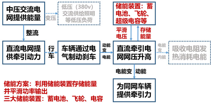 事實(shí)上,目前使用的儲(chǔ)能技術(shù)方案,比起單純地把站臺(tái)修高則要復(fù)雜和有效得多,為地鐵系統(tǒng)節(jié)能降耗提供了更多的調(diào)度和使用的靈活性,其能量流轉(zhuǎn)過程如下圖所示,儲(chǔ)能的代表技術(shù)主要有蓄電池儲(chǔ)能、電容儲(chǔ)能、飛輪儲(chǔ)能3種。