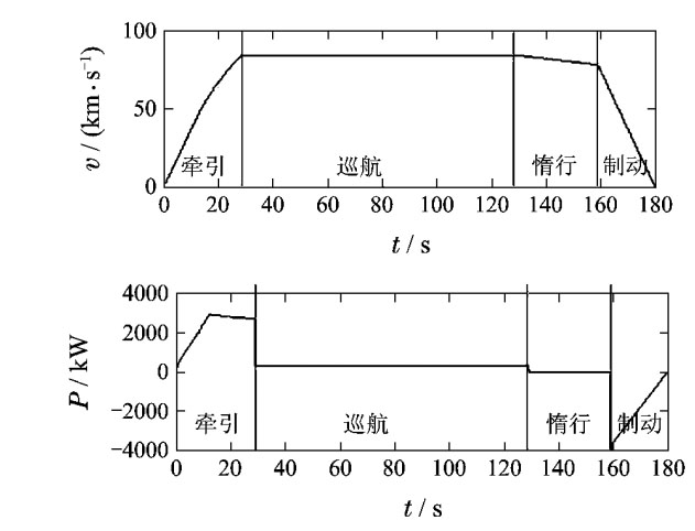 如上圖所示,車輛在站間運(yùn)行時(shí),先經(jīng)歷牽引階段,車輛由靜止開始加速,電機(jī)消耗較大的功率產(chǎn)生牽引力,車速加速至80km/h左右。之后,車輛進(jìn)入等速巡航階段,此時(shí)電網(wǎng)只需要提供較小的功率即可維持車輛的巡航,車輛快到站的時(shí)候,電網(wǎng)不再提供功率,車輛開始惰行,車速稍有降低,最后車輛進(jìn)入制動(dòng)階段,車速迅速減至0。