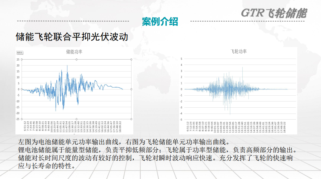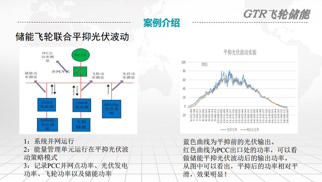 這個(gè)是我們做的一個(gè)功率均衡能力的一個(gè)試驗(yàn),在動(dòng)態(tài)和穩(wěn)態(tài)的情況下都可以有很好的均流。這是我們所做的一些實(shí)驗(yàn)項(xiàng)目,包括安全性檢驗(yàn)以及性能檢驗(yàn)方面。我們的應(yīng)用場(chǎng)景就是說一個(gè)是在傳統(tǒng)的火電廠輔助火電機(jī)組進(jìn)行一次調(diào)頻,采用這個(gè)飛輪加發(fā)電機(jī)組的形式。這樣有什么好處呢?就是可以輔助這個(gè)發(fā)電機(jī)組見效它的氣門開度時(shí)的機(jī)械損耗,還有能夠提升這個(gè)響應(yīng)速度。另外就針對(duì)分布式能源發(fā)電過程中的輸出功率波動(dòng)進(jìn)行補(bǔ)償抑制,見效分布式能源對(duì)電網(wǎng)功率的沖擊。在微電網(wǎng)可以平滑微網(wǎng)母線功率的波動(dòng),包括蓄電池的頻繁充放來減少它的次數(shù),另外是提高微電網(wǎng)電能質(zhì)量,頻率調(diào)節(jié)等等。另外一個(gè)領(lǐng)域就是軌道交通領(lǐng)域,一個(gè)是列車進(jìn)出站的再生制動(dòng)能量的回收應(yīng)用,還有就是節(jié)約牽引電能,減少飛輪磨損和暖通壓力。這是我們應(yīng)用的一些項(xiàng)目的案例,包括在微電網(wǎng)領(lǐng)域的英國(guó)的這兩個(gè)島嶼,還有我們國(guó)內(nèi)863的課題項(xiàng)目,還有地鐵公司和火電網(wǎng)的一次調(diào)頻項(xiàng)目。這是我們做的國(guó)家863課題計(jì)劃,這個(gè)是現(xiàn)場(chǎng)微電網(wǎng)的脫鋪結(jié)構(gòu)圖,整體加起來的話容量大概在1.5兆瓦。儲(chǔ)能平抑光伏波動(dòng)的控制策略就是利用飛輪的快速響應(yīng)來平緩這種瞬時(shí)的大功率波動(dòng)。右邊這個(gè)圖是實(shí)時(shí)的光伏的波動(dòng),紅色的是平抑之后的曲線,大家可以看出這個(gè)平抑后的功率相對(duì)平滑,效果較明顯。這個(gè)是儲(chǔ)能和飛輪輸出的一個(gè)功率的波形,咱們可以看到這個(gè)電池儲(chǔ)能是屬于能量型,飛輪屬于功率型,整體對(duì)這個(gè)光伏的波動(dòng)也有一個(gè)很好的平抑。