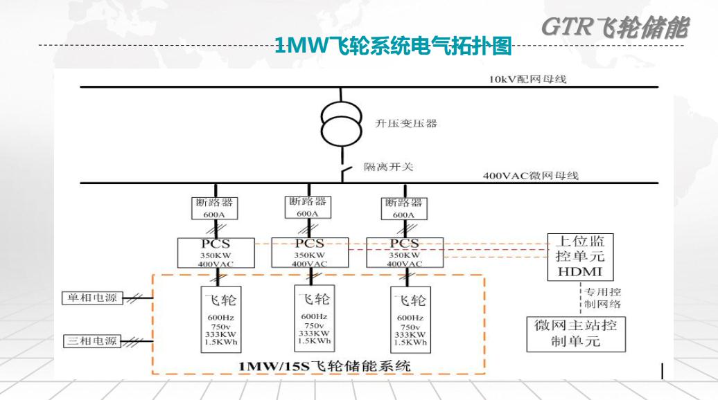 另外一個(gè)是應(yīng)用在調(diào)頻,我們?cè)黾舆@個(gè)實(shí)時(shí)性是采用本地控制策略。粉色曲線是投入飛輪之前微網(wǎng)頻率的波動(dòng),藍(lán)色是投入飛輪之后微網(wǎng)頻率的波動(dòng),可以看到這個(gè)投入之后的效果還是不錯(cuò)的。這個(gè)是1兆瓦飛輪系統(tǒng)電氣拓?fù)鋱D,這是我們1兆瓦的飛輪系統(tǒng)集裝箱內(nèi)部的示意圖,這里面包括我們飛輪驅(qū)動(dòng)柜還有直流開關(guān)柜、PCS還有監(jiān)控、消防都在里面。