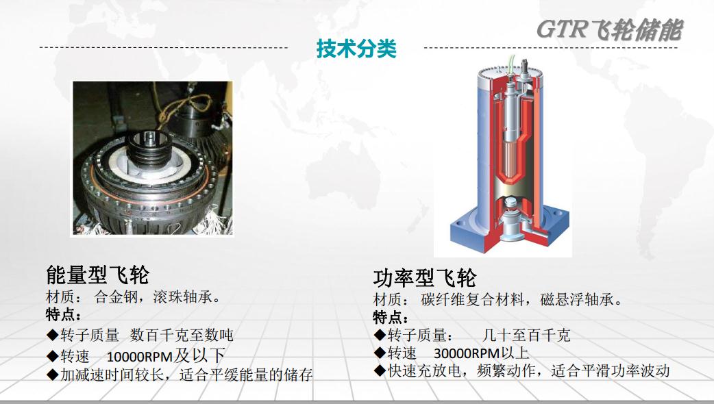 下面介紹一下國(guó)內(nèi)外的主要應(yīng)用,首先是有這種兆瓦級(jí)的飛輪電廠,為智能電網(wǎng)提供系統(tǒng)調(diào)頻服務(wù),提高電網(wǎng)的穩(wěn)定性。其次是利用這個(gè)飛輪頻繁充放大功率的特性,在軌道交通這種再生制動(dòng)能量的回收,牽引網(wǎng)壓支撐。還有夠是平抑光伏風(fēng)電波動(dòng),延遲蓄電池壽命、削峰填谷,調(diào)節(jié)電網(wǎng)母線頻率穩(wěn)定。還有一個(gè)是在這個(gè)UPS務(wù)領(lǐng)域這種不間斷電源,比如說助理這種柴油機(jī)啟動(dòng)。下面向大家匯報(bào)一下這個(gè)高功率GTR飛輪,我們這個(gè)飛輪的技術(shù)來源最初是來自于URENCO公司,是一家核工業(yè)技術(shù)公司。這是我們飛輪組成系統(tǒng)的剖面圖,這個(gè)地方是它的被動(dòng)磁軸承部分,這個(gè)地方是電機(jī)的定子,這個(gè)地方是轉(zhuǎn)子的外轉(zhuǎn)子結(jié)構(gòu),高速旋轉(zhuǎn)的轉(zhuǎn)子。核心技術(shù)主要是:第一,碳纖維復(fù)合材料轉(zhuǎn)子,這個(gè)是高強(qiáng)度、抗拉伸、MLC軟磁嵌入工藝。第二,被動(dòng)磁軸承,第三是高速永磁電機(jī)。GTR飛輪技術(shù)屬于高轉(zhuǎn)速小轉(zhuǎn)動(dòng)慣量大功率技術(shù)路線,這是我們裝置的一些簡(jiǎn)單的參數(shù),高比功率是3000W/Kg,充放電頻率可以這樣理解,就是說可以在90秒時(shí)間內(nèi)可以完成15秒的充15秒的放,90秒的周期循環(huán)。還有就是超長(zhǎng)的壽命,1千萬次大于20年循環(huán)壽命。這個(gè)地方介紹的是我們飛輪的一個(gè)簡(jiǎn)單的工作邏輯,這個(gè)飛輪由靜止?fàn)顟B(tài)首先是一個(gè)加速,加速到30赫茲的時(shí)候會(huì)進(jìn)行一個(gè)自身?yè)p耗的測(cè)試,小于它的限定值的時(shí)候會(huì)再次加速。這是我們的一個(gè)能量管理單元,它可以協(xié)調(diào)控制多臺(tái)飛輪儲(chǔ)能裝置,比如說通過一鍵起動(dòng)、本地遠(yuǎn)程操作的方式,還有多個(gè)模塊的充放電能量均衡控制,還有SOC狀態(tài)監(jiān)控。還有它的故障日志,以及根據(jù)不同的應(yīng)用場(chǎng)景都可以來進(jìn)行調(diào)整的。