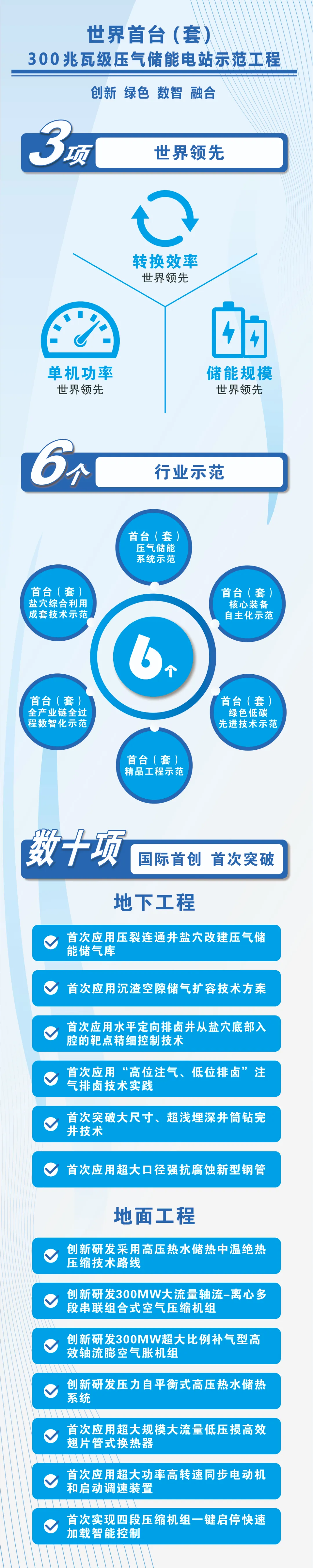 項目利用應(yīng)城地區(qū)廢棄鹽礦作為儲氣庫是鹽穴型壓氣儲能電站,在項目建設(shè)過程中,中國能建聯(lián)合建設(shè)各方實現(xiàn)了項目關(guān)鍵核心技術(shù)裝備100%國產(chǎn)化、攻克了工藝系統(tǒng)集成地下儲氣庫建造、關(guān)鍵裝備研發(fā)等諸多難題,形成了該領(lǐng)域的自主產(chǎn)權(quán)和標準體系鍛造了一系列國際首創(chuàng)技術(shù)和配套產(chǎn)品。