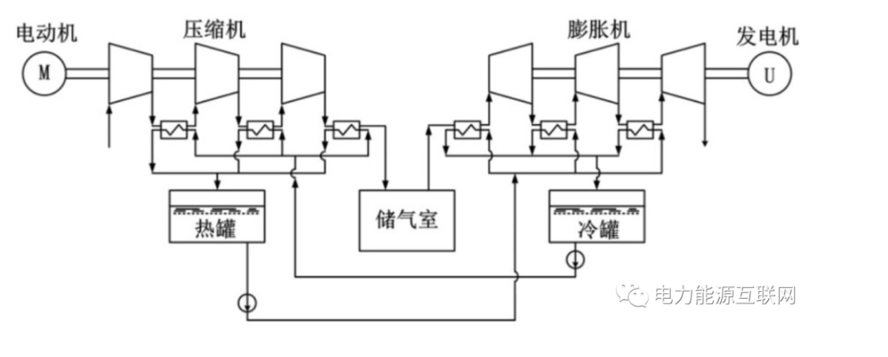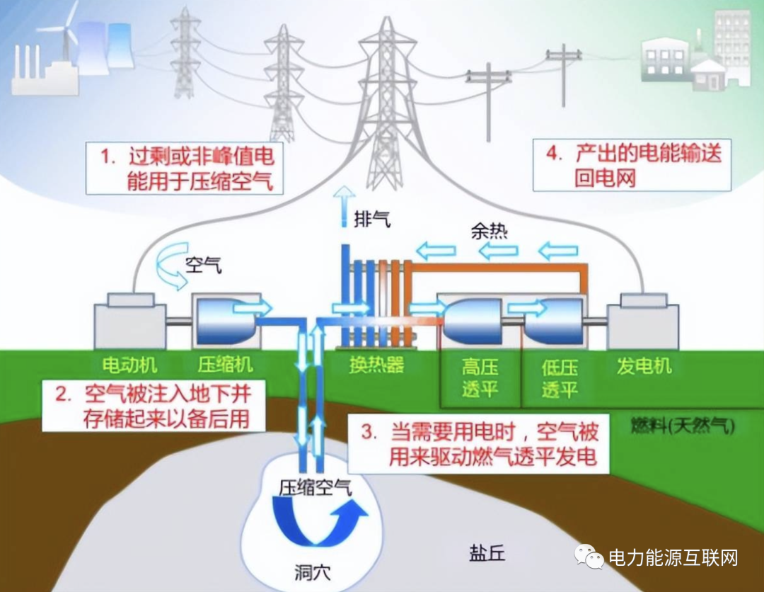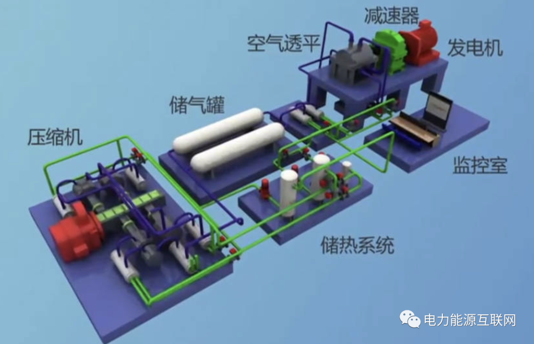 壓縮空氣儲能,是指在電網(wǎng)負荷低谷期將電能用于壓縮空氣,在電網(wǎng)負荷高峰期釋放壓縮空氣推動汽輪機發(fā)電的儲能方式。形式主要有,傳統(tǒng)壓縮空氣儲能系統(tǒng)、帶儲熱裝置的壓縮空氣儲能系統(tǒng)、液氣壓縮儲能系統(tǒng)。